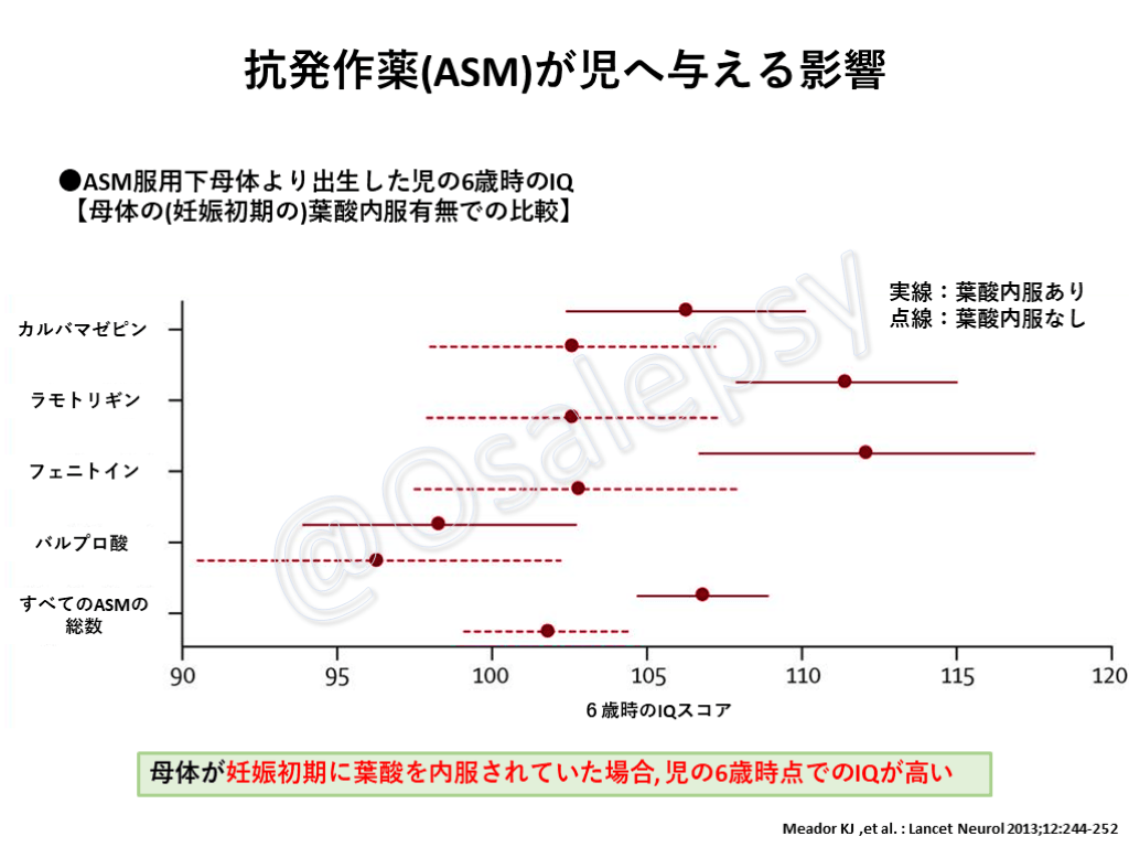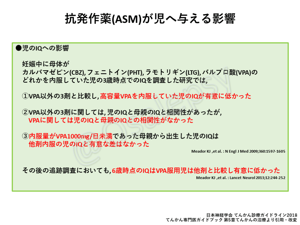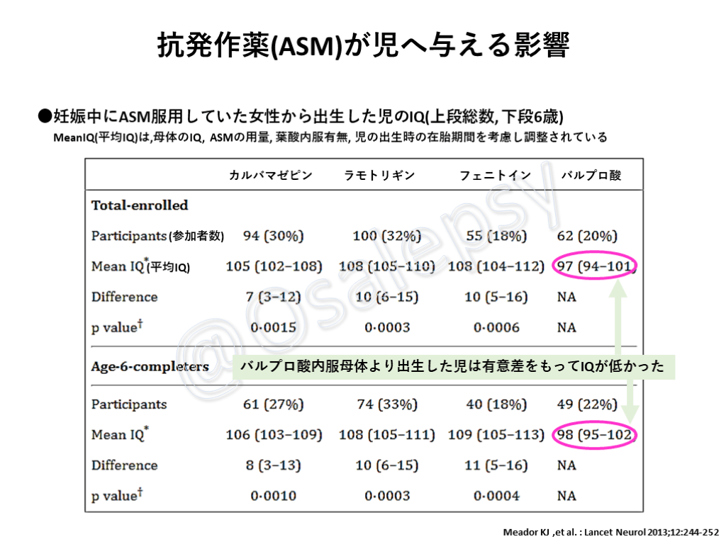 カルバマゼピン ラモトリギン フェニトイン バルプロ酸 (参加者数) (平均IQ) @Osalepsy バルプロ酸内服母体より出生した児は有意差をもってIQが低かった #15.