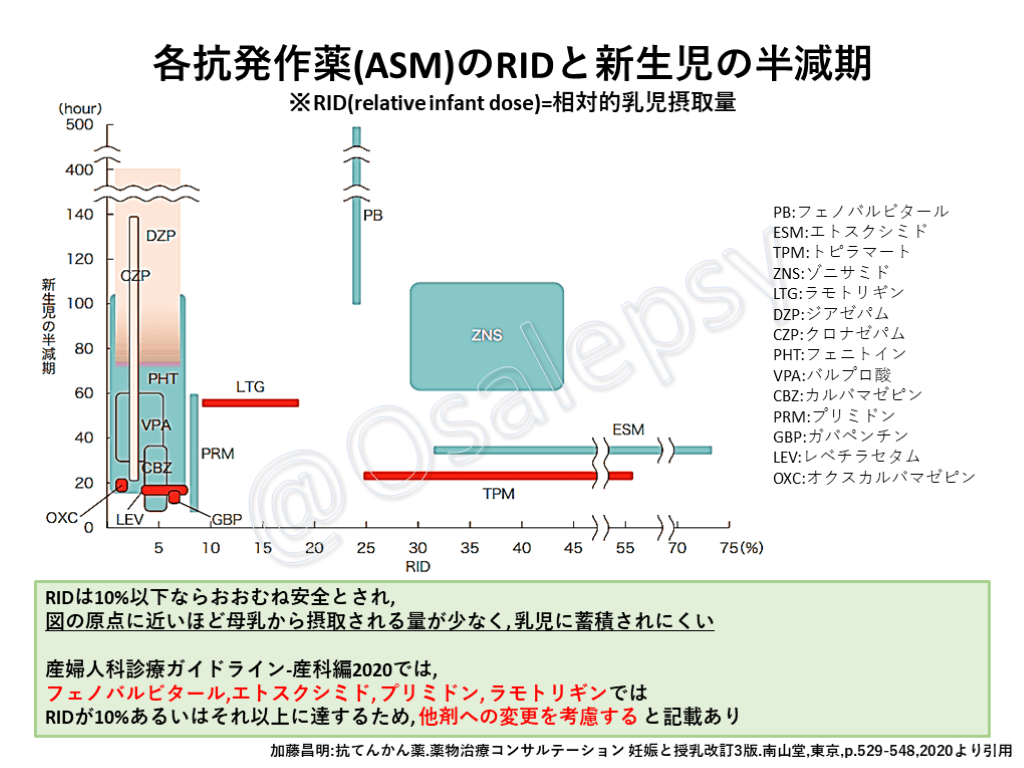 ※RID(relative infant dose)=相対的乳児摂取量 @Osalepsy 加藤昌明:抗てんかん薬.薬物治療コンサルテーション 妊娠と授乳改訂3版.南山堂,東京,p.529-548,2020より引用 RIDは10%以下ならおおむね安全とされ,
