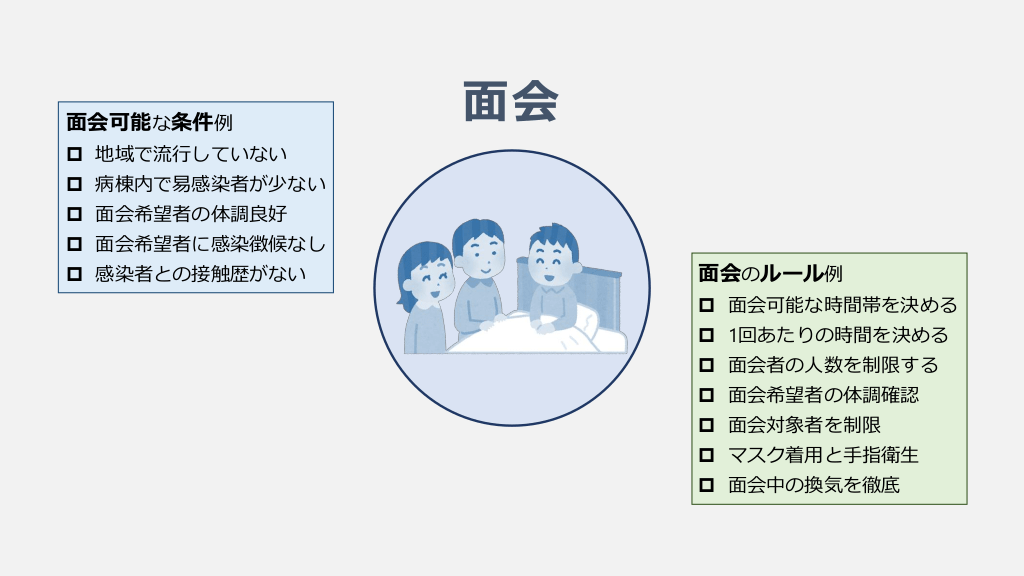#10. 面会可能な条件例 面会 地域で流行していない 病棟内で易感染者が少ない 面会希望者の体調良好 面会希望者に感染徴候なし 感染者との接触歴がない 面会のルール例 面会可能な時間帯を決める 1回あたりの時間を決める 面会者の人数を制限する 面会希望者の体調確認 面会対象者を制限 マスク着用と手指衛生 面会中の換気を徹底