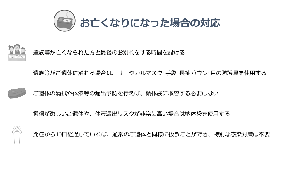 #11. お亡くなりになった場合の対応 遺族等が亡くなられた方と最後のお別れをする時間を設ける 遺族等がご遺体に触れる場合は、サージカルマスク・手袋・長袖ガウン・目の防護具を使用する ご遺体の清拭や体液等の漏出予防を行えば、納体袋に収容する必要はない 損傷が激しいご遺体や、体液漏出リスクが非常に高い場合は納体袋を使用する 発症から10日経過していれば、通常のご遺体と同様に扱うことができ、特別な感染対策は不要