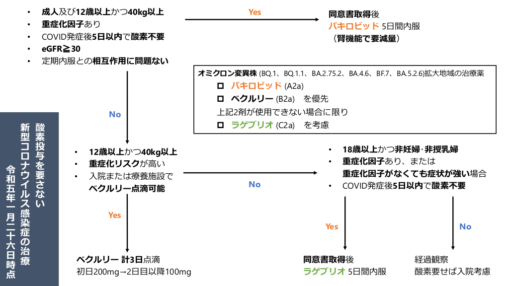 #16. • • • • • 成人及び12歳以上かつ40kg以上 重症化因子あり COVID発症後5日以内で酸素不要 eGFR≧30 定期内服との相互作用に問題ない Yes 同意書取得後 パキロビッド 5日間内服 (腎機能で要減量) オミクロン変異株 (BQ.1、BQ.1.1、BA.2.75.2、BA.4.6、BF.7、BA.5.2.6)拡大地域の治療薬 パキロビッド (A2a) ベクルリー (B2a) No 令 和 五 年 一 月 二 十 六 日 時 点 新 型 コ ロ ナ ウ イ ル ス 感 染 症 の 治 療 酸 素 投 与 を 要 さ な い 上記2剤が使用できない場合に限り ラゲブリオ (C2a) • • • 12歳以上かつ40kg以上 重症化リスクが高い 入院または療養施設で ベクルリー点滴可能 を優先 を考慮 • • No • 18歳以上かつ非妊婦・非授乳婦 重症化因子あり、または 重症化因子がなくても症状が強い場合 COVID発症後5日以内で酸素不要 Yes Yes ベクルリー 計3日点滴 初日200mg→2日目以降100mg 同意書取得後 ラゲブリオ 5日間内服 No 経過観察 酸素要せば入院考慮