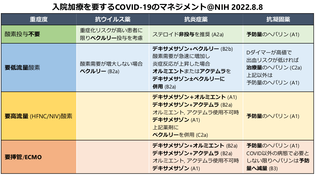 #17. 入院加療を要するCOVID-19のマネジメント@NIH 2022.8.8 重症度 抗ウイルス薬 抗炎症薬 抗凝固薬 重症化リスクが高い患者に 限りベクルリー投与を考慮 ステロイド非投与を推奨 (A2a) 予防量のヘパリン (A1) 酸素需要が増大しない場合 ベクルリー (B2a) デキサメサゾン+ベクルリー (B2b) 酸素需要が急速に増加し 炎症反応が上昇した場合 オルミエントまたはアクテムラを デキサメサゾン±ベクルリーに 併用 (B2a) Dダイマーが高値で 出血リスクが低ければ 治療量のヘパリン (C2a) 上記以外は 予防量のヘパリン (A1) 要高流量 (HFNC/NIV)酸素 デキサメサゾン+オルミエント (A1) デキサメサゾン+アクテムラ (B2a) オルミエント, アクテムラ使用不可時 デキサメサゾン (A1) 上記薬剤に ベクルリーを併用 (C2a) 予防量のヘパリン (A1) 要挿管/ECMO デキサメサゾン+オルミエント (B2a) デキサメサゾン+アクテムラ (B2a) オルミエント, アクテムラ使用不可時 デキサメサゾン (A1) 予防量のヘパリン (A1) COVID以外の病態で必要と しない限りヘパリンは予防 量へ減量 (B3) 酸素投与不要 要低流量酸素