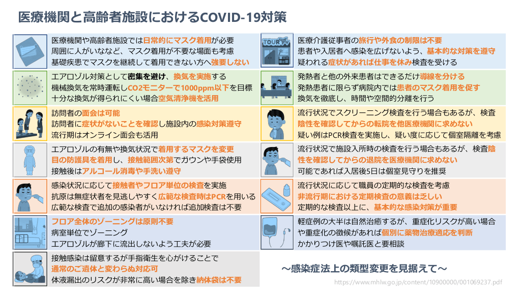 #2. 医療機関と高齢者施設におけるCOVID-19対策 医療機関や高齢者施設では日常的にマスク着用が必要 周囲に人がいななど、マスク着用が不要な場面も考慮 基礎疾患でマスクを継続して着用できない方へ強要しない 医療介護従事者の旅行や外食の制限は不要 患者や入居者へ感染を広げないよう、基本的な対策を遵守 疑われる症状があれば仕事を休み検査を受ける エアロゾル対策として密集を避け、換気を実施する 機械換気を常時運転しCO2モニターで1000ppm以下を目標 十分な換気が得られにくい場合空気清浄機を活用 発熱者と他の外来患者はできるだけ導線を分ける 発熱患者に限らず病院内では患者のマスク着用を促す 換気を徹底し、時間や空間的分離を行う 訪問者の面会は可能 訪問者に症状がないことを確認し施設内の感染対策遵守 流行期はオンライン面会も活用 流行状況でスクリーニング検査を行う場合もあるが、検査 陰性を確認してからの転院を他医療機関に求めない 疑い例はPCR検査を実施し、疑い度に応じて個室隔離を考慮 エアロゾルの有無や換気状況で着用するマスクを変更 目の防護具を着用し、接触範囲次第でガウンや手袋使用 接触後はアルコール消毒や手洗い遵守 流行状況で施設入所時の検査を行う場合もあるが、検査陰 性を確認してからの退院を医療機関に求めない 可能であれば入居後5日は個室見守りを推奨 感染状況に応じて接触者やフロア単位の検査を実施 抗原は無症状者を見逃しやすく広範な検査時はPCRを用いる 広範な検査で追加の感染者がいなければ追加検査は不要 流行状況に応じて職員の定期的な検査を考慮 非流行期における定期検査の意義は乏しい 定期的な検査以上に、基本的な感染対策が重要 フロア全体のゾーニングは原則不要 病室単位でゾーニング エアロゾルが廊下に流出しないよう工夫が必要 軽症例の大半は自然治癒するが、重症化リスクが高い場合 や重症化の徴候があれば個別に薬物治療適応を判断 かかりつけ医や嘱託医と要相談 接触感染は留意するが手指衛生を心がけることで 通常のご遺体と変わらぬ対応可 体液漏出のリスクが非常に高い場合を除き納体袋は不要 ~感染症法上の類型変更を見据えて~ https://www.mhlw.go.jp/content/10900000/001069237.pdf