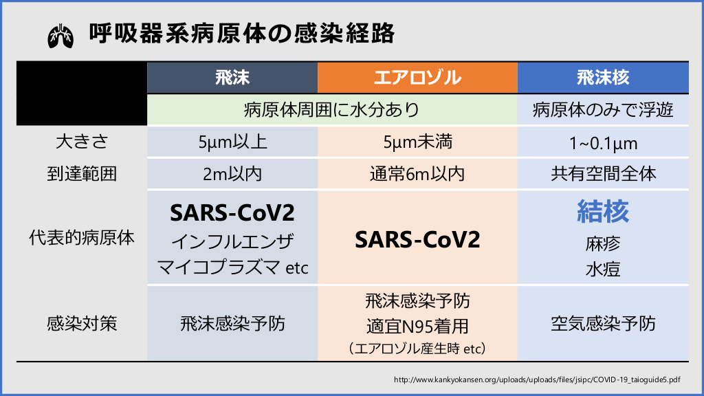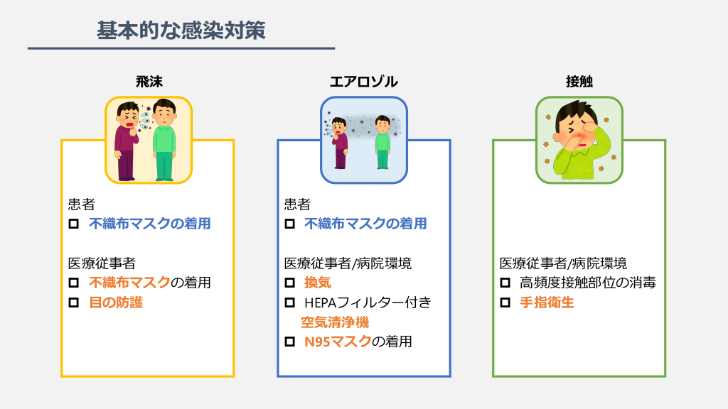 #5. 基本的な感染対策 飛沫 エアロゾル 患者 不織布マスクの着用 患者 不織布マスクの着用 医療従事者 不織布マスクの着用 目の防護 医療従事者/病院環境 換気 HEPAフィルター付き 空気清浄機 N95マスクの着用 接触 医療従事者/病院環境 高頻度接触部位の消毒 手指衛生