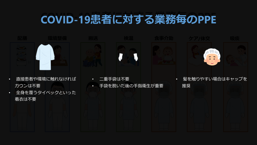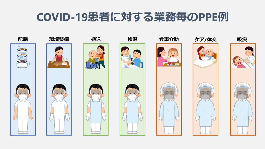 #7. COVID-19患者に対する業務毎のPPE例 配膳 環境整備 搬送 検温 食事介助 ケア/体交 吸痰