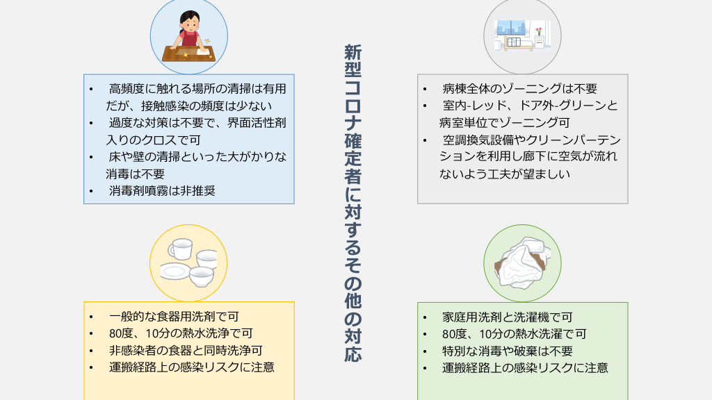 #9. • 高頻度に触れる場所の清掃は有用 だが、接触感染の頻度は少ない 過度な対策は不要で、界面活性剤 入りのクロスで可 床や壁の清掃といった大がかりな 消毒は不要 消毒剤噴霧は非推奨 • • • • 一般的な食器用洗剤で可 80度、10分の熱水洗浄で可 非感染者の食器と同時洗浄可 運搬経路上の感染リスクに注意 • • • 新 型 コ ロ ナ 確 定 者 に 対 す る そ の 他 の 対 応 • • • • • • • 病棟全体のゾーニングは不要 室内-レッド、ドア外-グリーンと 病室単位でゾーニング可 空調換気設備やクリーンパーテン ションを利用し廊下に空気が流れ ないよう工夫が望ましい 家庭用洗剤と洗濯機で可 80度、10分の熱水洗濯で可 特別な消毒や破棄は不要 運搬経路上の感染リスクに注意