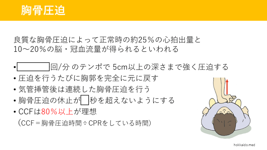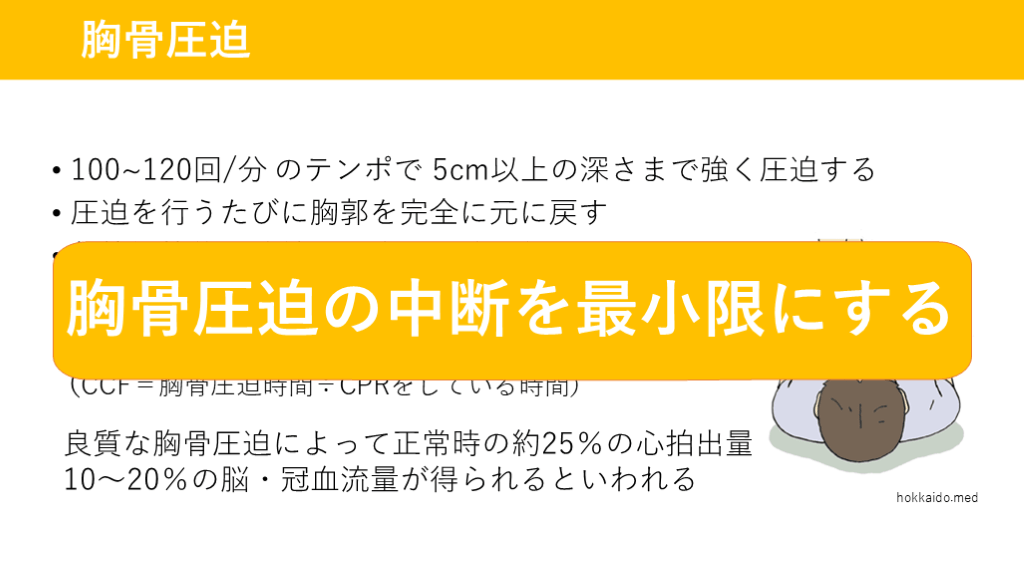 (CCF=胸骨圧迫時間÷CPRをしている時間) hokkaido.med 胸骨圧迫 胸骨圧迫の中断を最小限にする