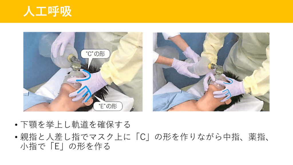 親指と人差し指でマスク上に「C」の形を作りながら中指、薬指、小指で「E」の形を作る 人工呼吸