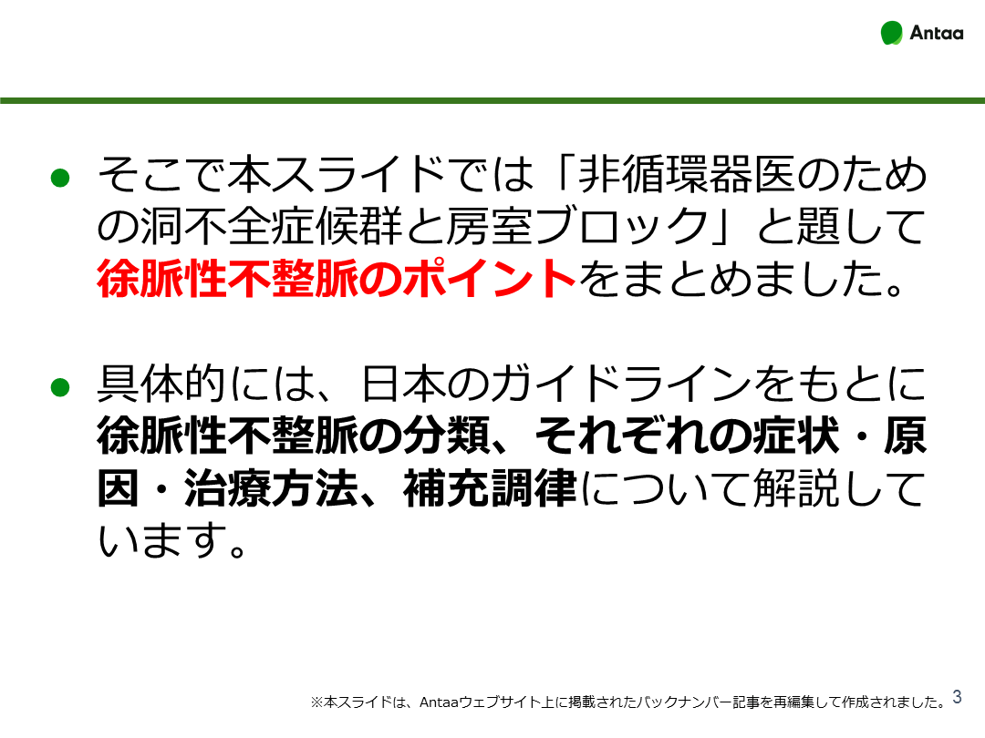 本スライドでは「非循環器医のための洞不全症候群と房室ブロック」と題して徐脈性不整脈のポイントをまとめました。