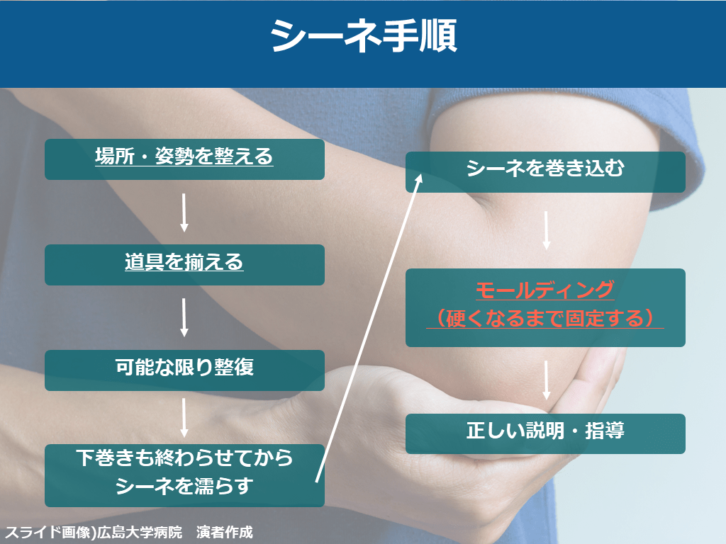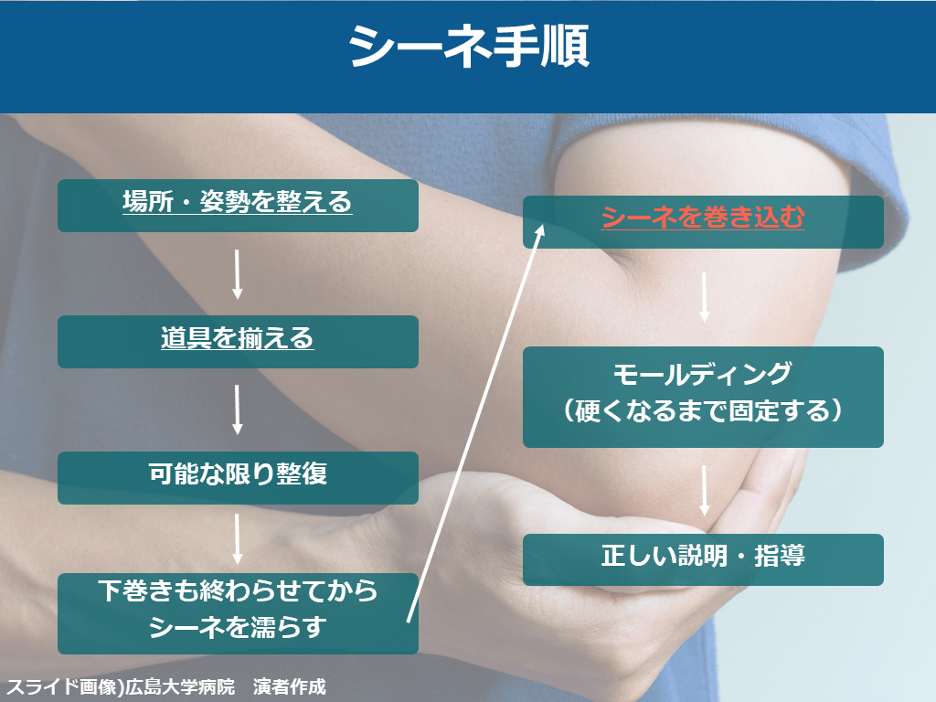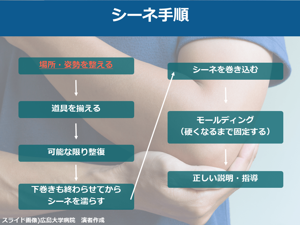 #4. スライド画像)広島大学病院 演者作成 シーネ手順 場所・姿勢を整える 道具を揃える 可能な限り整復 下巻きも終わらせてから
