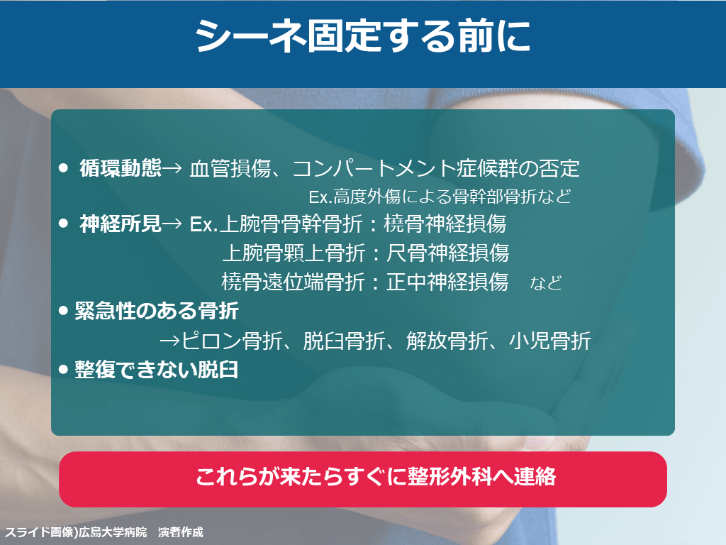 #5. スライド画像)広島大学病院 演者作成 シーネ固定する前に 循環動態→ 血管損傷、コンパートメント症候群の否定