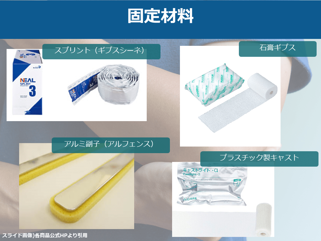 #8. スライド画像)各商品公式HPより引用 固定材料 スプリント(ギプスシーネ) アルミ副子(アルフェンス) 石膏ギプス プラスチック製キャスト