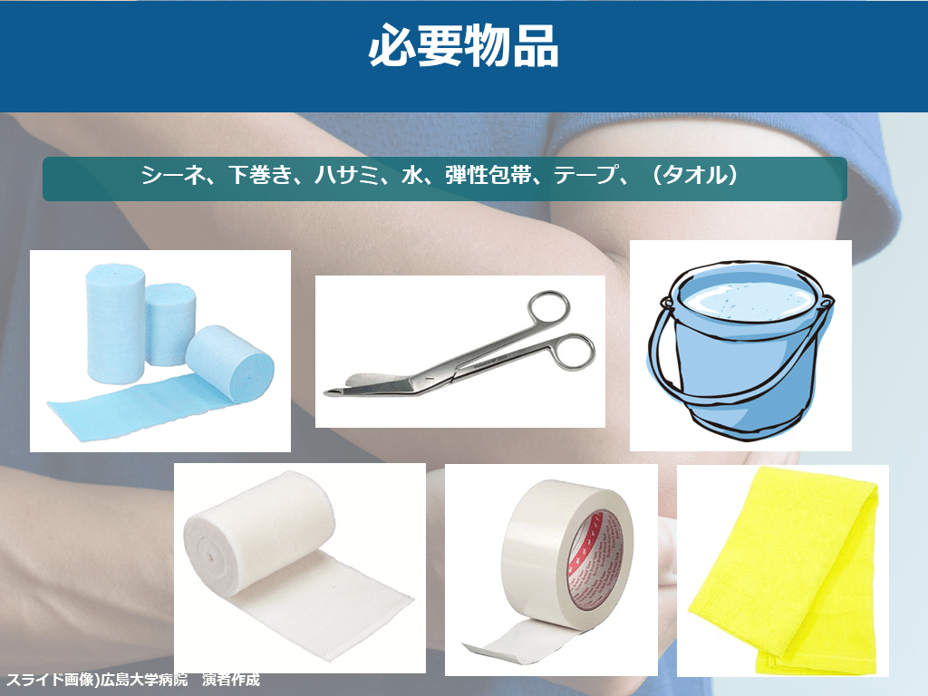 #9. スライド画像)広島大学病院 演者作成 必要物品 シーネ、下巻き、ハサミ、水、弾性包帯、テープ、(タオル)