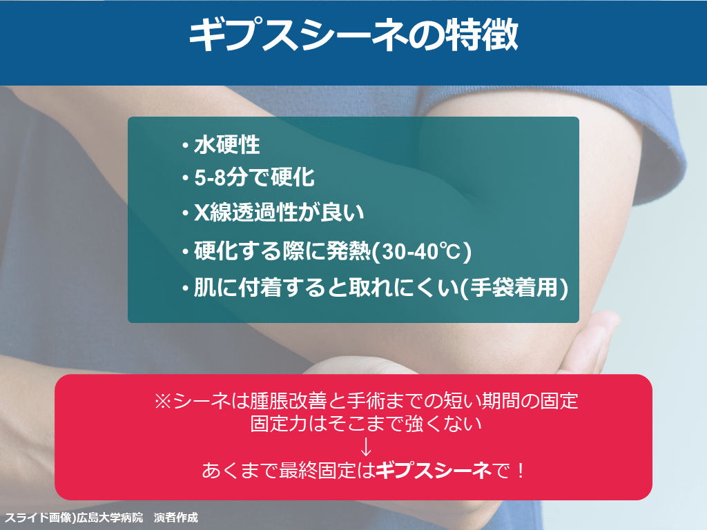 #10. スライド画像)広島大学病院 演者作成 ギプスシーネの特徴 水硬性