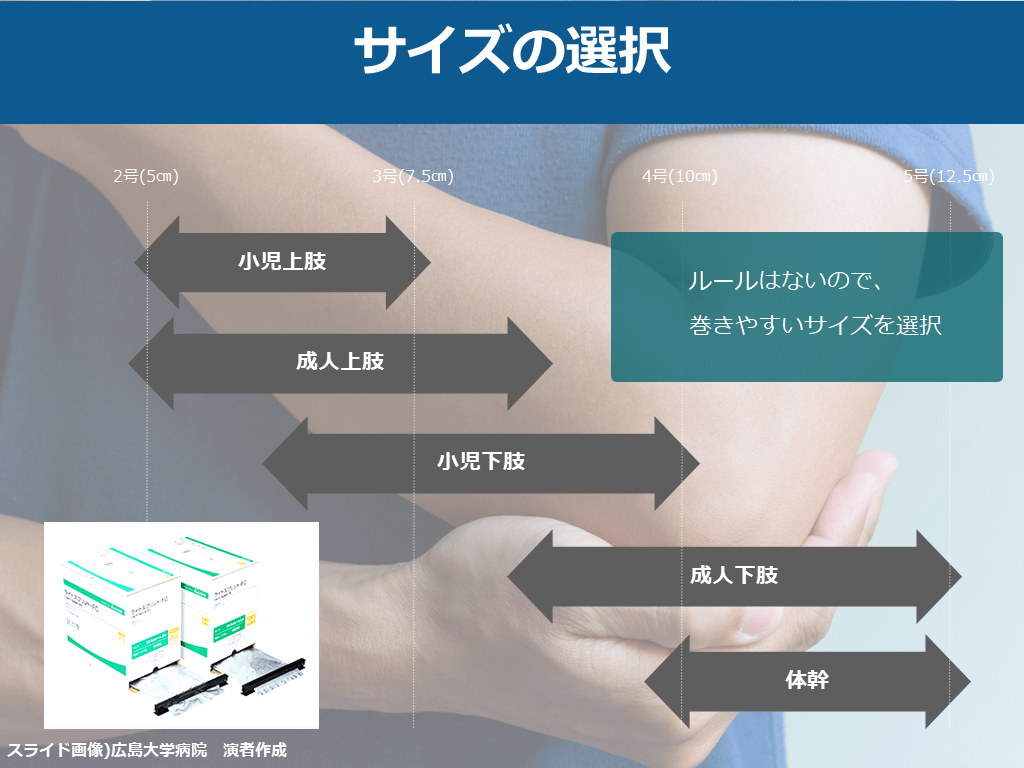 #11. スライド画像)広島大学病院 演者作成 サイズの選択 体幹 成人下肢 小児下肢 成人上肢 小児上肢 2号(5㎝) 5号(12.5㎝) 4号(10㎝) 3号(7.5㎝) ルールはないので、
