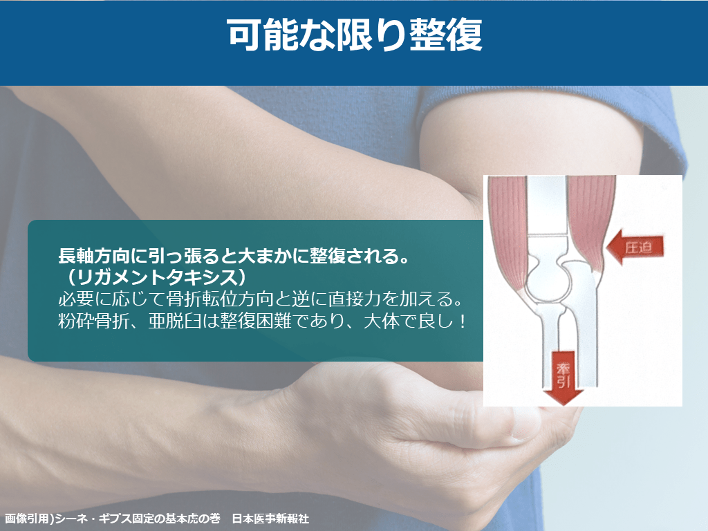 #13. 可能な限り整復 長軸方向に引っ張ると大まかに整復される。