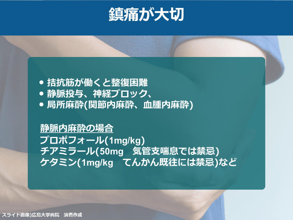 #14. スライド画像)広島大学病院 演者作成 鎮痛が大切 拮抗筋が働くと整復困難
