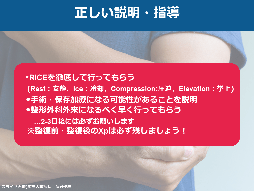 #22. スライド画像)広島大学病院 演者作成 正しい説明・指導 RICEを徹底して行ってもらう