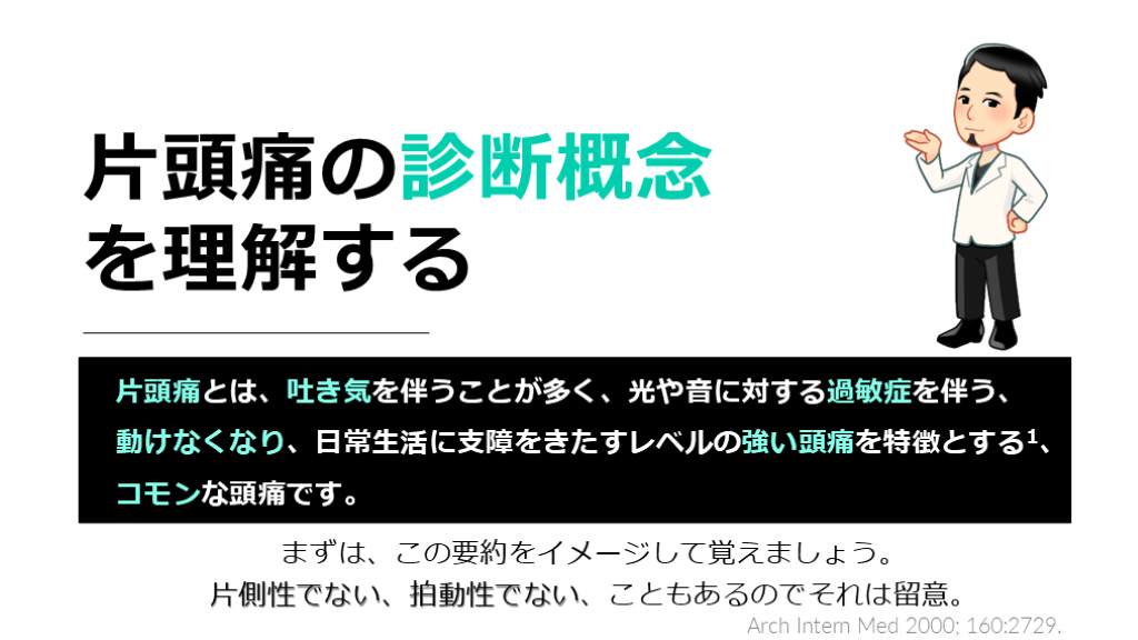 片側性でない、拍動性でない、こともあるのでそれは留意。 Arch Intern Med 2000; 160:2729.