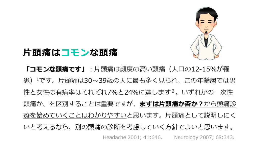 #6. 片頭痛はコモンな頭痛 「コモンな頭痛です」:片頭痛は頻度の高い頭痛(人口の12-15%が罹患)1です。片頭痛は30~39歳の人に最も多く見られ、この年齢層では男性と女性の有病率はそれぞれ7%と24%に達します2。いずれかの一次性頭痛か、を区別することは重要ですが、まずは片頭痛か否か?から頭痛診療を始めていくことはわかりやすいと思います。片頭痛として説明しにくいと考えるなら、別の頭痛の診断を考慮していく方針でよいと思います。 Headache 2001; 41:646. Neurology 2007; 68:343.