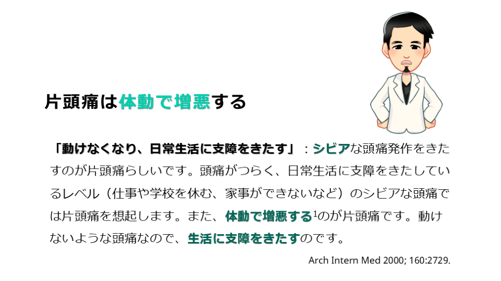 #7. 片頭痛は体動で増悪する 「動けなくなり、日常生活に支障をきたす」:シビアな頭痛発作をきたすのが片頭痛らしいです。頭痛がつらく、日常生活に支障をきたしているレベル(仕事や学校を休む、家事ができないなど)のシビアな頭痛では片頭痛を想起します。また、体動で増悪する1のが片頭痛です。動けないような頭痛なので、生活に支障をきたすのです。 Arch Intern Med 2000; 160:2729.