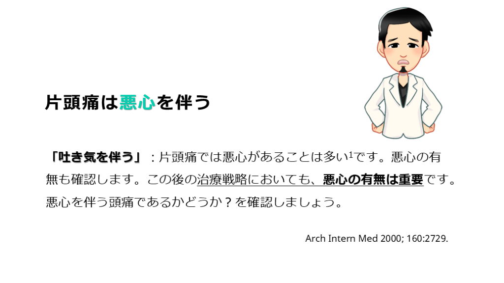 #8. 片頭痛は悪心を伴う 「吐き気を伴う」:片頭痛では悪心があることは多い1です。悪心の有無も確認します。この後の治療戦略においても、悪心の有無は重要です。悪心を伴う頭痛であるかどうか?を確認しましょう。 Arch Intern Med 2000; 160:2729.