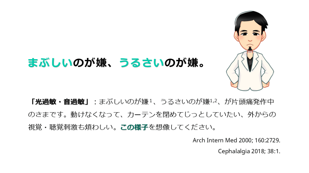 #9. まぶしいのが嫌、うるさいのが嫌。 「光過敏・音過敏」:まぶしいのが嫌1、うるさいのが嫌1,2、が片頭痛発作中のさまです。動けなくなって、カーテンを閉めてじっとしていたい、外からの視覚・聴覚刺激も煩わしい。この様子を想像してください。 Arch Intern Med 2000; 160:2729. Cephalalgia 2018; 38:1.