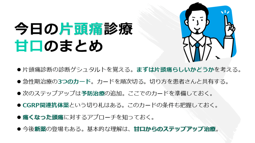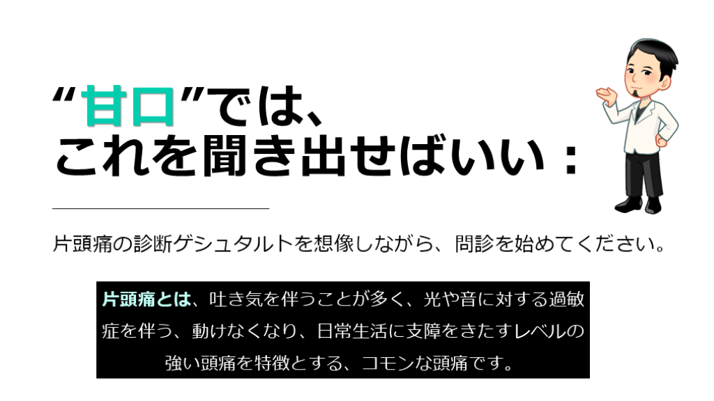 甘口のまとめ 片頭痛診断の診断ゲシュタルトを覚える。まずは片頭痛らしいかどうかを考える。