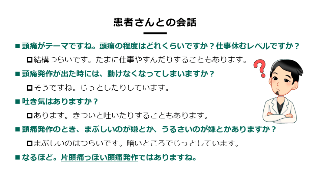 #11. 患者さんとの会話 頭痛がテーマですね。頭痛の程度はどれくらいですか?仕事休むレベルですか?
