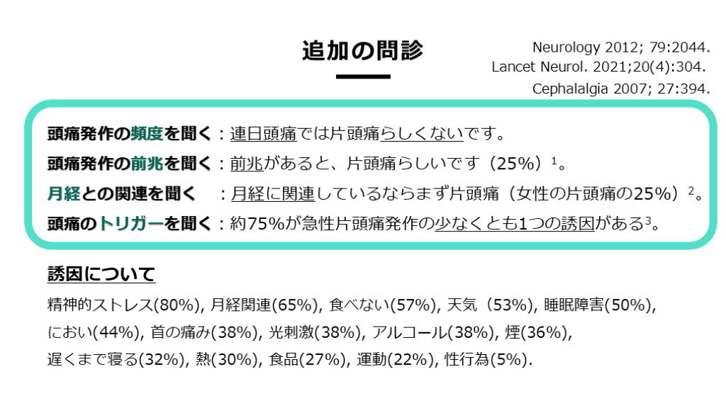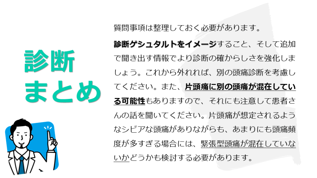 診断ゲシュタルトをイメージすること、そして追加で聞き出す情報でより診断の確からしさを強化しましょう。これから外れれば、別の頭痛診断を考慮してください。また、片頭痛に別の頭痛が混在している可能性もありますので、それにも注意して患者さんの話を聞いてください。片頭痛が想定されるようなシビアな頭痛がありながらも、あまりにも頭痛頻度が多すぎる場合には、緊張型頭痛が混在していないかどうかも検討する必要があります。
