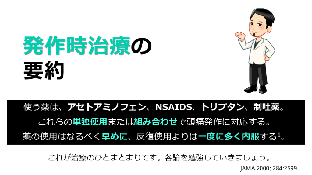 薬の使用はなるべく早めに、反復使用よりは一度に多く内服する1。 これが治療のひとまとまりです。各論を勉強していきましょう。 JAMA 2000; 284:2599.