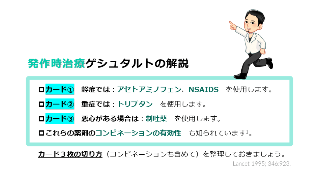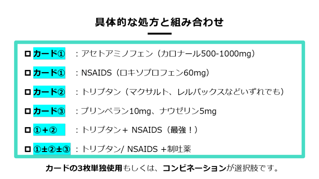 ①±②±③ :トリプタン/ NSAIDS +制吐薬 カードの3枚単独使用もしくは、コンビネーションが選択肢です。