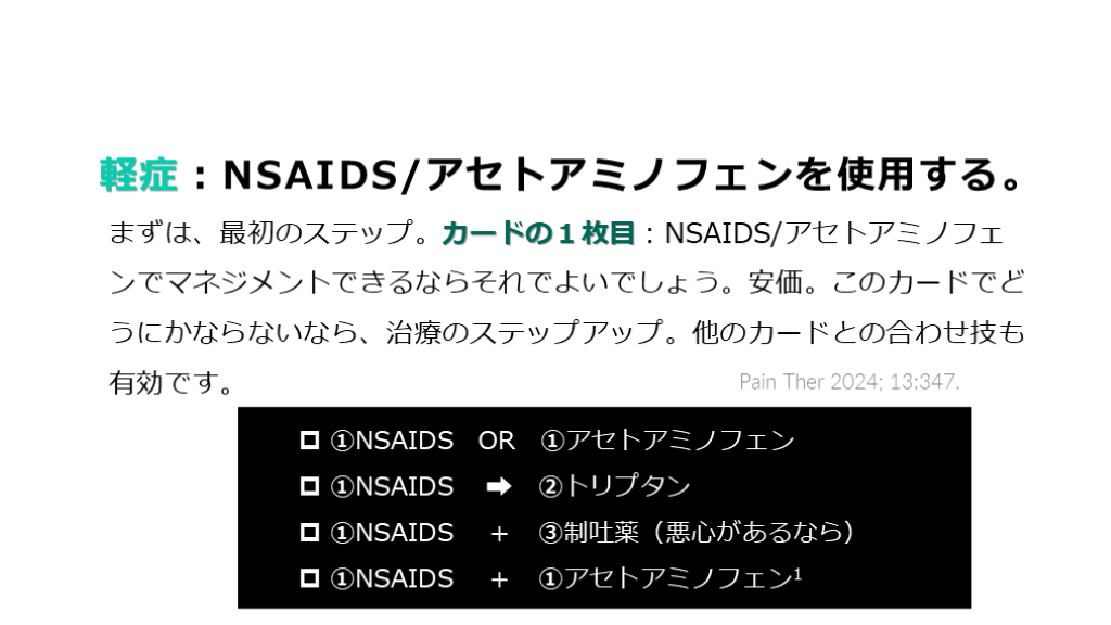 #18. 発作時治療ゲシュタルトの解説 カード① 軽症では:アセトアミノフェン、NSAIDS を使用します。