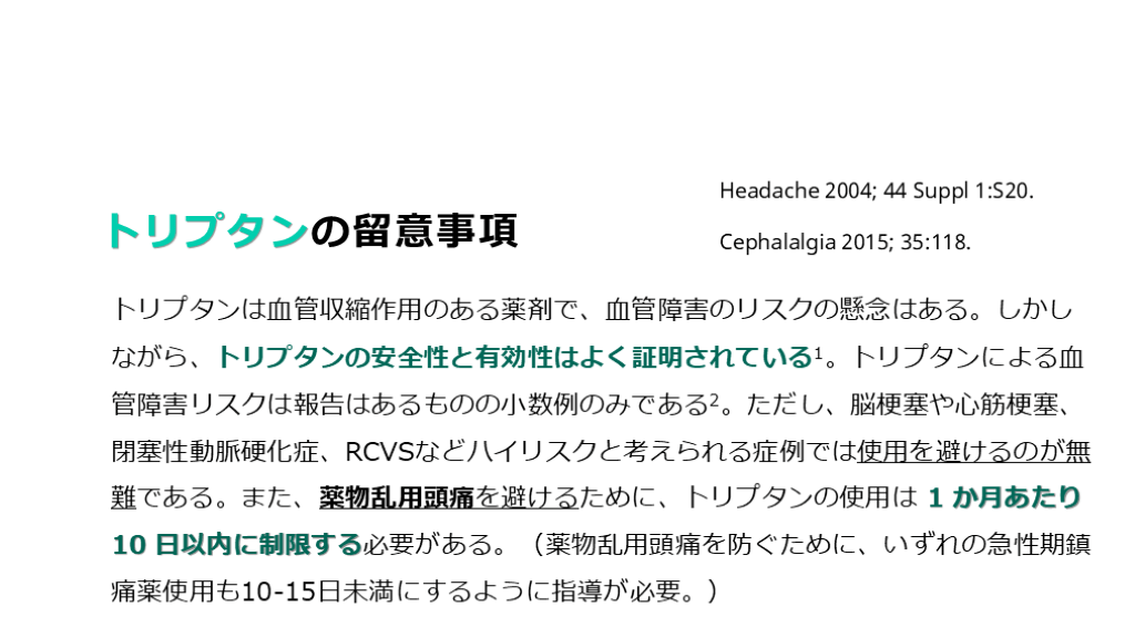 #22. トリプタンの留意事項 トリプタンは血管収縮作用のある薬剤で、血管障害のリスクの懸念はある。しかしながら、トリプタンの安全性と有効性はよく証明されている1。トリプタンによる血管障害リスクは報告はあるものの小数例のみである2。ただし、脳梗塞や心筋梗塞、閉塞性動脈硬化症、RCVSなどハイリスクと考えられる症例では使用を避けるのが無難である。また、薬物乱用頭痛を避けるために、トリプタンの使用は 1 か月あたり 10 日以内に制限する必要がある。(薬物乱用頭痛を防ぐために、いずれの急性期鎮痛薬使用も10-15日未満にするように指導が必要。) Headache 2004; 44 Suppl 1:S20. Cephalalgia 2015; 35:118.