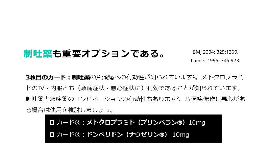 #23. 制吐薬も重要オプションである。 3枚目のカード:制吐薬の片頭痛への有効性が知られています1。メトクロプラミドのIV・内服とも(頭痛症状・悪心症状に)有効であることが知られています。制吐薬と鎮痛薬のコンビネーションの有効性もあります2。片頭痛発作に悪心がある場合は使用を検討しましょう。