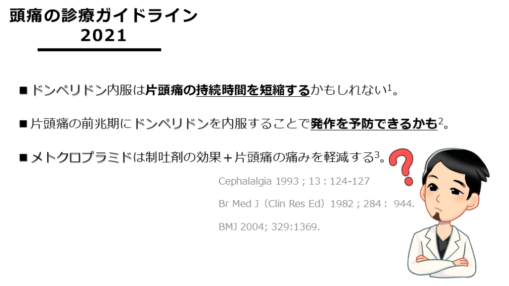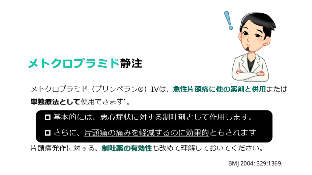 片頭痛発作に対する、制吐薬の有効性も改めて理解しておいてください。 BMJ 2004; 329:1369.