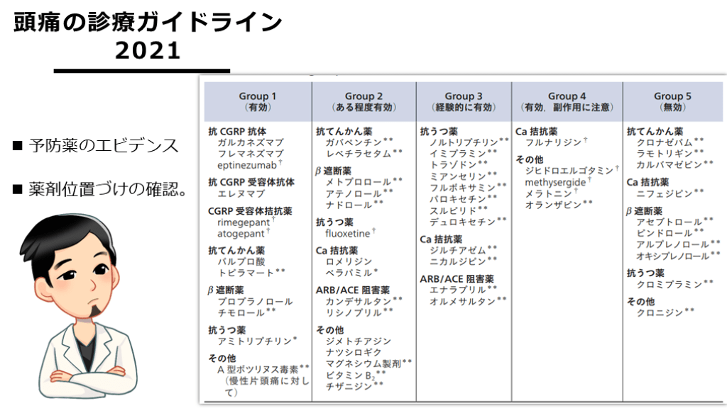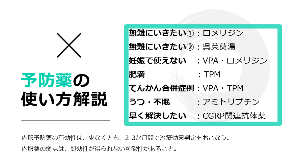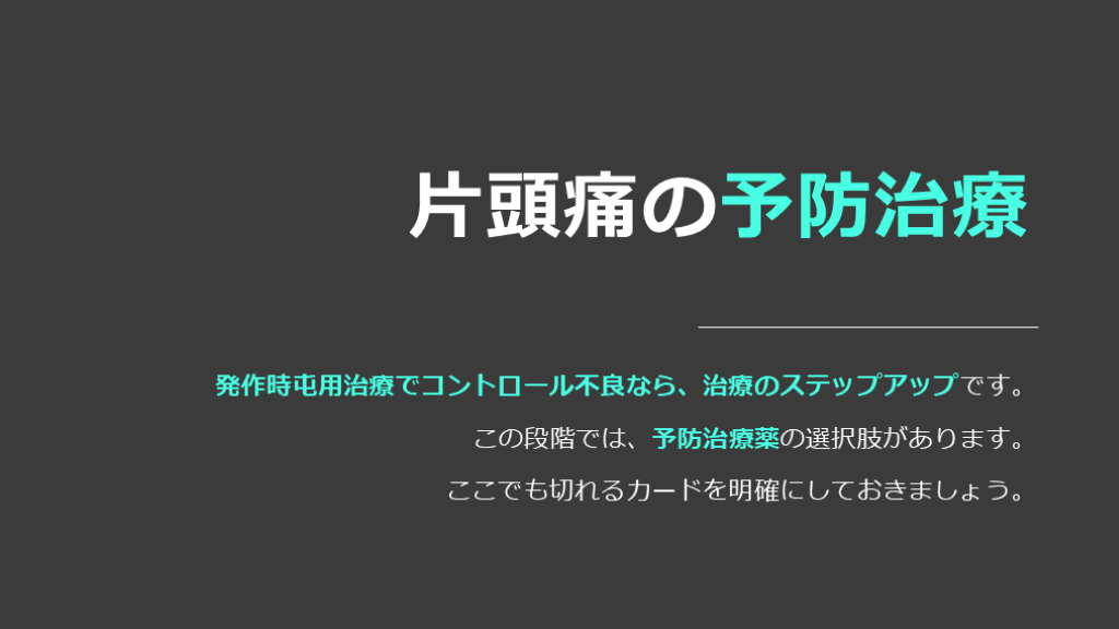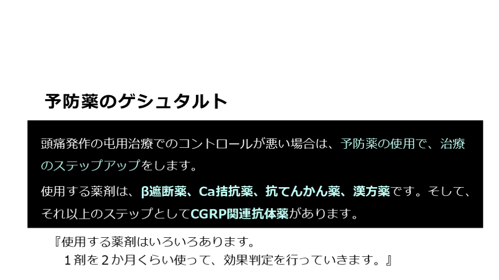 1剤を2か月くらい使って、効果判定を行っていきます。』 頭痛発作の屯用治療でのコントロールが悪い場合は、予防薬の使用で、治療のステップアップをします。