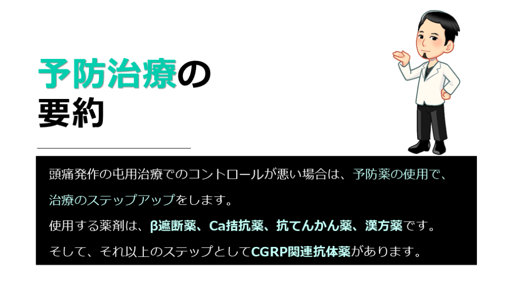 使用する薬剤は、β遮断薬、Ca拮抗薬、抗てんかん薬、漢方薬です。そして、それ以上のステップとしてCGRP関連抗体薬があります。