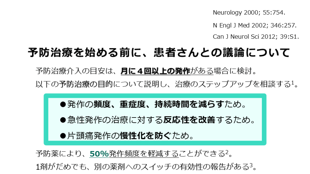 予防薬導入のメリットもあります。』 ●発作の頻度、重症度、持続時間を減らすため。
