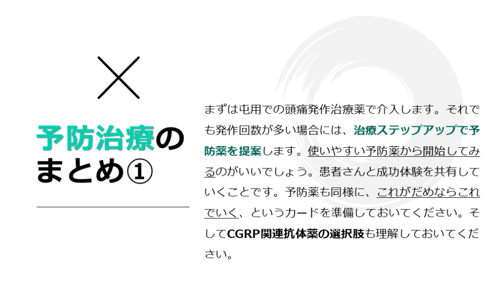 まとめ① まずは屯用での頭痛発作治療薬で介入します。それでも発作回数が多い場合には、治療ステップアップで予防薬を提案します。使いやすい予防薬から開始してみるのがいいでしょう。患者さんと成功体験を共有していくことです。予防薬も同様に、これがだめならこれでいく、というカードを準備しておいてください。そしてCGRP関連抗体薬の選択肢も理解しておいてください。