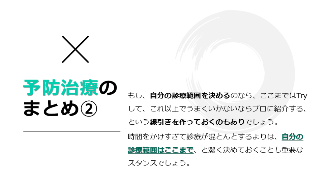 まとめ② もし、自分の診療範囲を決めるのなら、ここまではTryして、これ以上でうまくいかないならプロに紹介する、という線引きを作っておくのもありでしょう。
