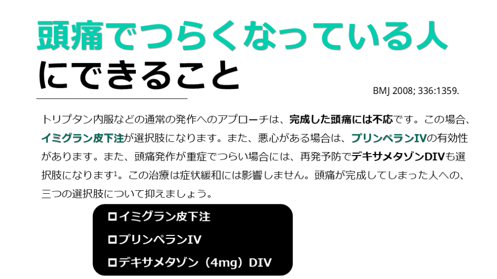 にできること トリプタン内服などの通常の発作へのアプローチは、完成した頭痛には不応です。この場合、イミグラン皮下注が選択肢になります。また、悪心がある場合は、プリンペランIVの有効性があります。また、頭痛発作が重症でつらい場合には、再発予防でデキサメタゾンDIVも選択肢になります1。この治療は症状緩和には影響しません。頭痛が完成してしまった人への、三つの選択肢について抑えましょう。