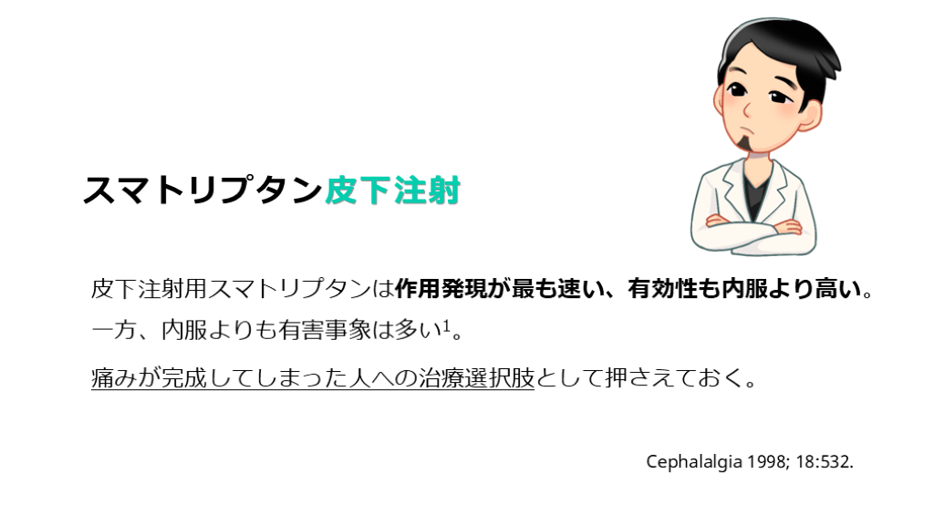 #45. スマトリプタン皮下注射 皮下注射用スマトリプタンは作用発現が最も速い、有効性も内服より高い。一方、内服よりも有害事象は多い1。