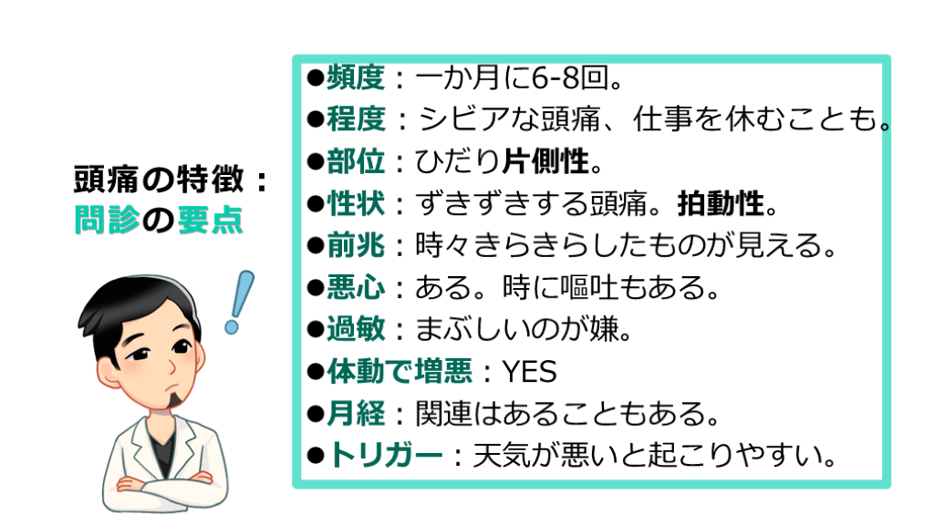 #13. 追加の問診 頭痛発作の頻度を聞く:連日頭痛では片頭痛らしくないです。