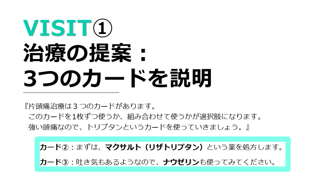3つのカードを説明 カード②:まずは、マクサルト(リザトリプタン)という薬を処方します。