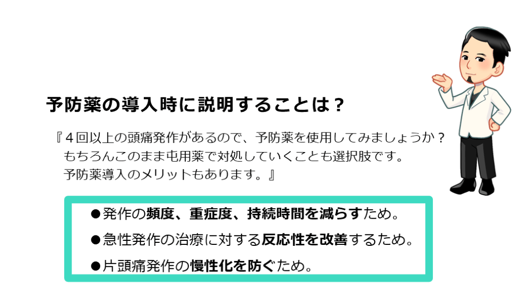 #54. 予防薬の導入時に説明することは? 『4回以上の頭痛発作があるので、予防薬を使用してみましょうか?