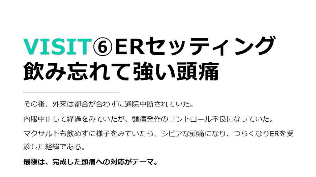 マクサルトも飲めずに様子をみていたら、シビアな頭痛になり、つらくなりERを受診した経緯である。 最後は、完成した頭痛への対応がテーマ。