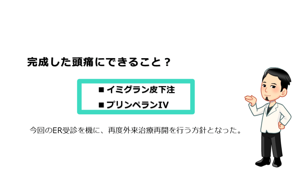 プリンペランIV 今回のER受診を機に、再度外来治療再開を行う方針となった。
