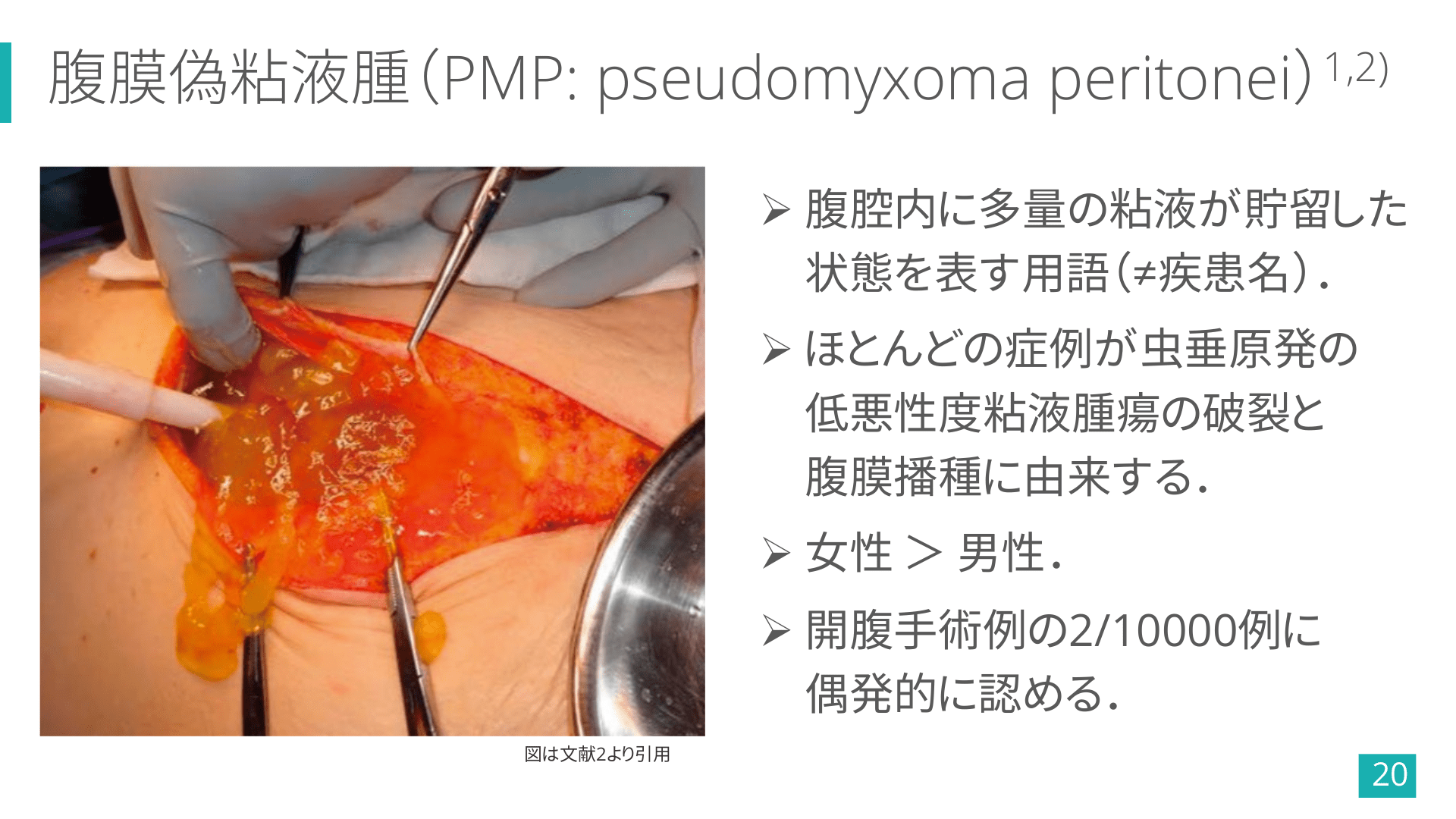 #20. 腹膜偽粘液腫(PMP: pseudomyxoma 1,2) peritonei) Ø 腹腔内に多量の粘液が貯留した 状態を表す用語(≠疾患名). Ø ほとんどの症例が虫垂原発の 低悪性度粘液腫瘍の破裂と 腹膜播種に由来する. Ø 女性 > 男性. Ø 開腹手術例の2/10000例に 偶発的に認める. 図は文献2より引用 20