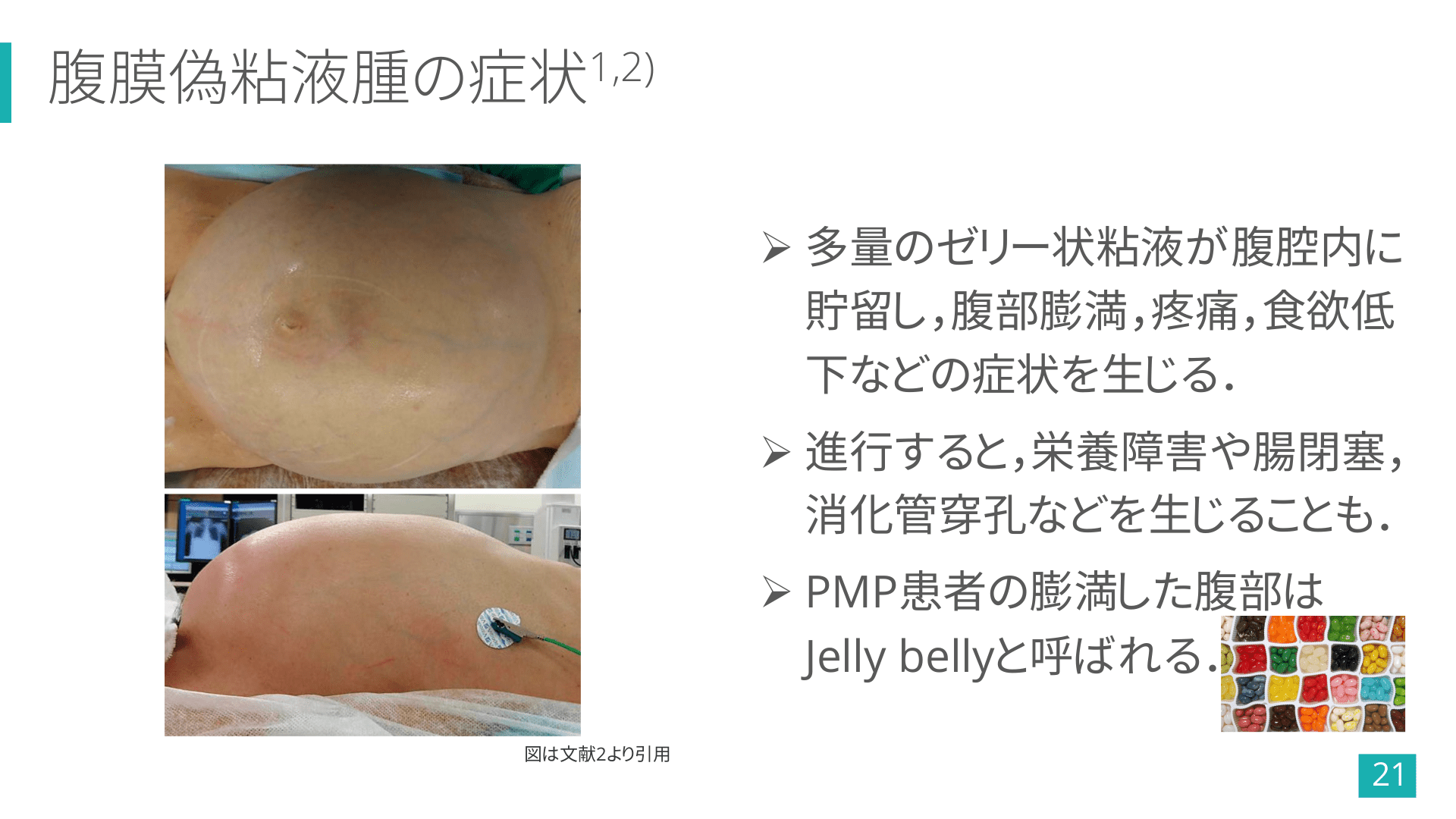 #21. 1,2) 腹膜偽粘液腫の症状 Ø 多量のゼリー状粘液が腹腔内に 貯留し,腹部膨満,疼痛,食欲低 下などの症状を生じる. Ø 進行すると,栄養障害や腸閉塞, 消化管穿孔などを生じることも. Ø PMP患者の膨満した腹部は Jelly bellyと呼ばれる. 図は文献2より引用 21
